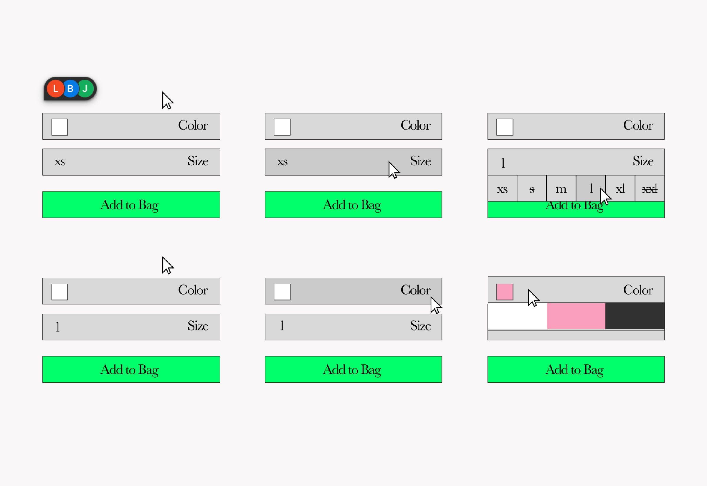 When it came to product customization touch points we took advantage of the CSS flexbox feature, and I designed a size and color select which was meant to both feel quantitative and fun in parallel to the sharp contemporary and paired down aesthetics of the platform.